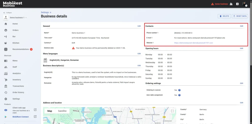 To update your business’s contact information, go to “Settings” → “Business.”(https://admin.mobirest.business/settings/business-settings)