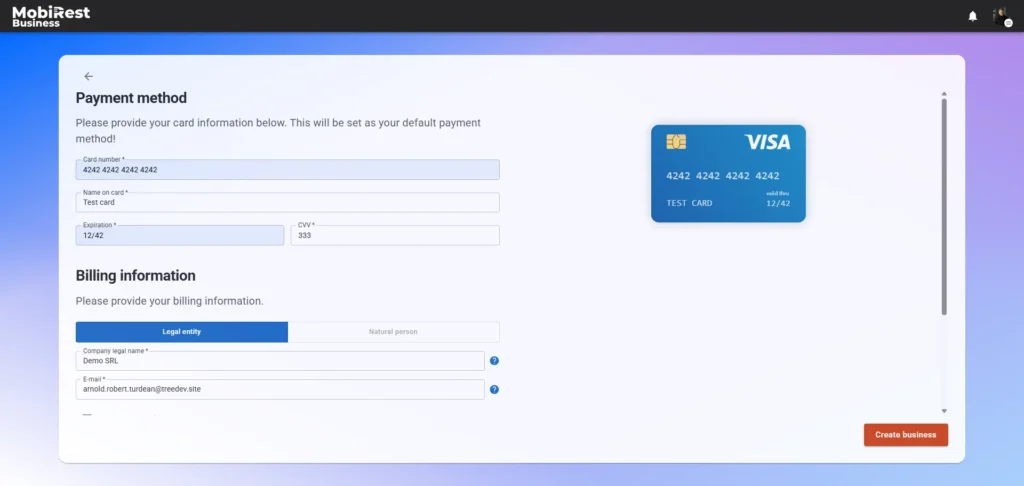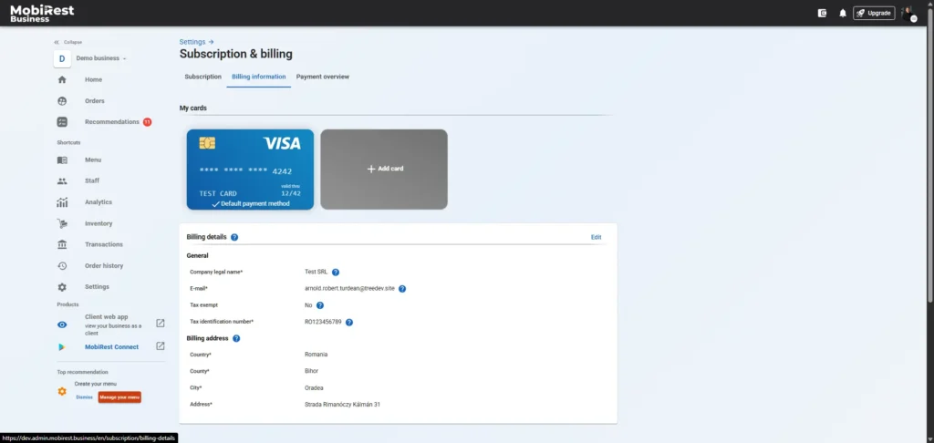 On the Billing Information (https://admin.mobirest.business/en/subscription/billing-details) page, you can manage your payment methods and billing details.