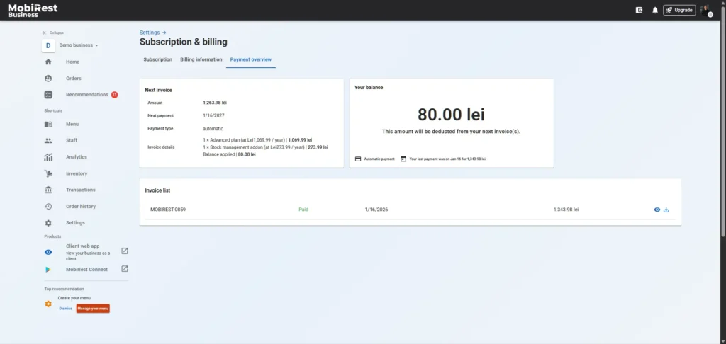 On the Payment Overview page (https://admin.mobirest.business/en/subscription/payment-overview), you can view a summary of your upcoming invoice, your balance and a list of past invoices. You can also review previous payments and download the corresponding invoices.