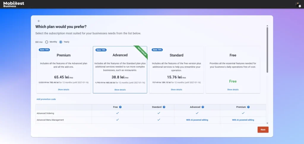 During business creation, you can choose the subscription plan that best fits your needs. You may also use the system completely free without a subscription; however, we strongly recommend selecting a plan to access the features that matter most to your business.