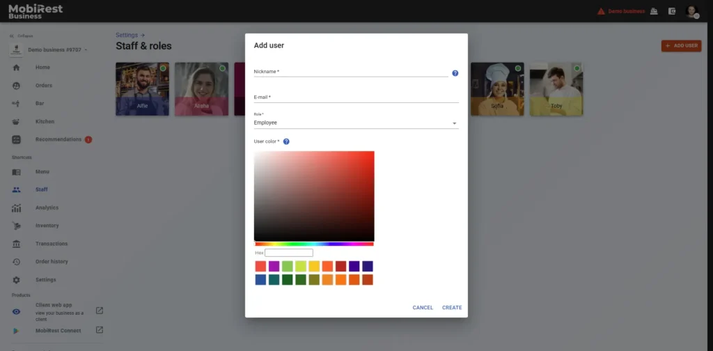 - Role: You must choose between the employee and admin roles. Admins have full access to your business, allowing them to configure settings, manage the menu, handle subscriptions, and more. Employees cannot access the business website, but they can still use the MobiRest Business application for their daily tasks.