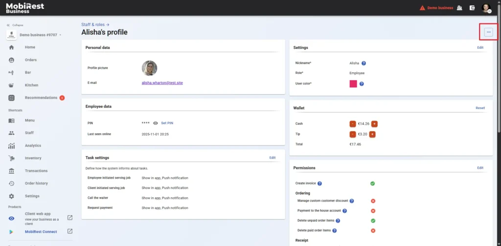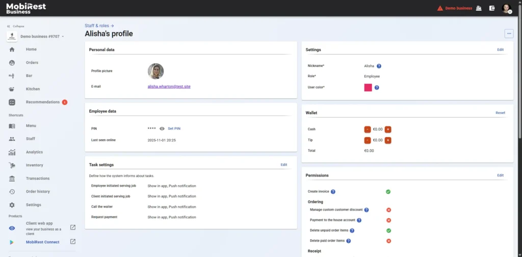In the MobiRest system, business owners and managers can add employees to their business by linking them to unique user profiles. Each employee has their own user account, which only they can manage. Business owners, however, can connect these user accounts—whether they’re new or already existing—to their business and set up employee profiles. These profiles belong to the business and can be managed by its administrators.