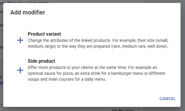 Modifiers (modifier groups) are additional options that can be added for a product which modifies the preparation process or adds extra ingredients or products to it. For example steak doneness, sauce selection for specific items or additional toppings.