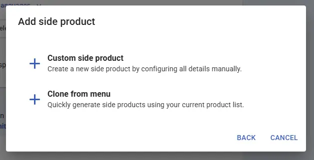 When choosing a side product, the system will prompt you to either create a custom side product or clone one or more products from your existing menu to use as a side product.