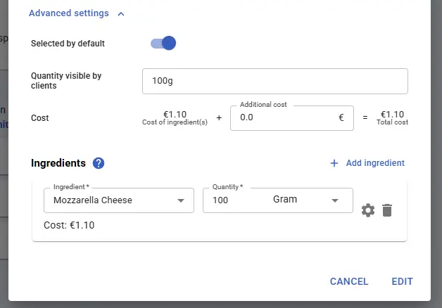 Finally, you can configure the ingredient list for the modifier. If a specific product variant requires additional ingredients, you can add them here. This is useful for tracking inventory and costs, such as when a customer requests extra mozzarella on their pizza or opts for an extra-large pizza instead of the standard size.