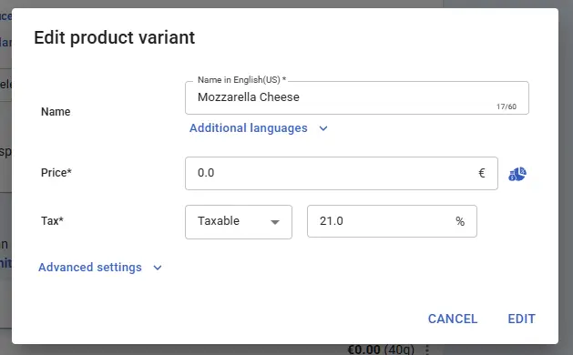 To add a product variant modifier, simply define its name (visible to customers), its price, and the applicable tax percentage.