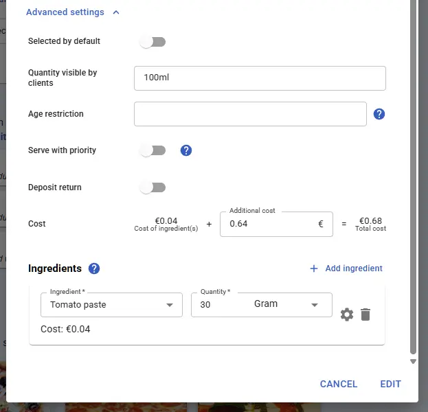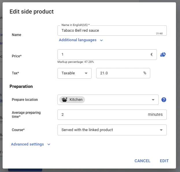 In case of a side product, there are also additional options in the advanced section, like the age restriction, serve with priority and the deposit return settings.