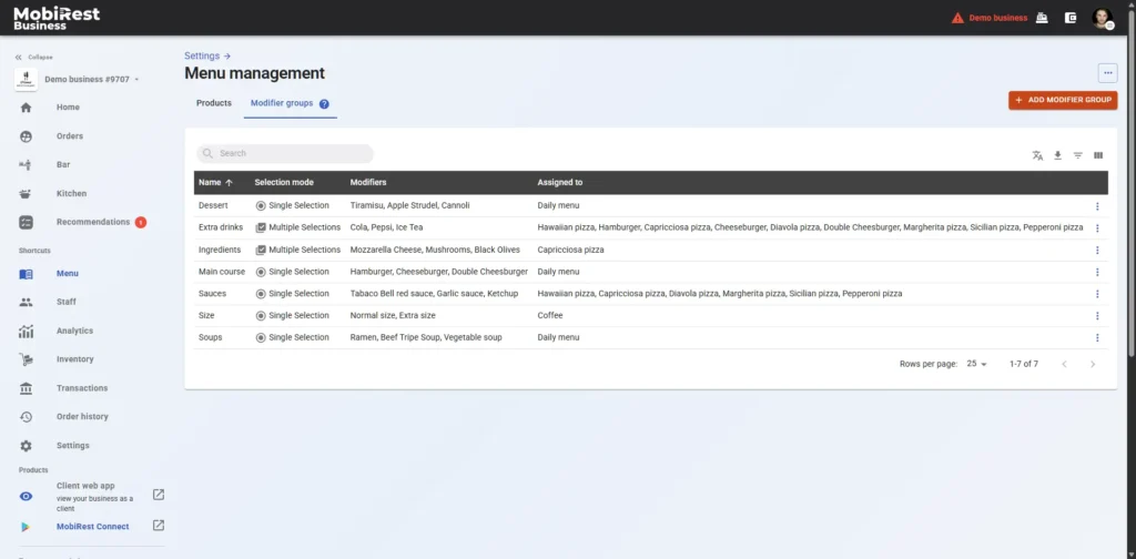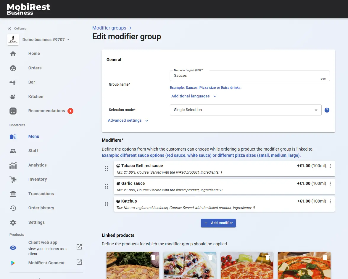 Modifier groups categorize similar modifiers, allowing them to be assigned to products as a set. For example, a “Sauces” modifier group could include options like Tabasco sauce, garlic sauce, ketchup, and more.
