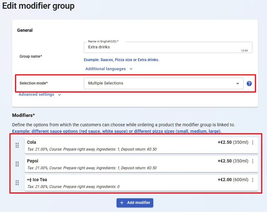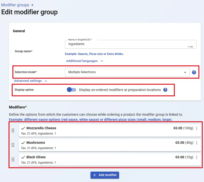 You can define the options from which the customers can choose while ordering a product the modifier group is linked to. Example: different sauce options (red sauce, white sauce) or different pizza sizes (small, medium, large).
