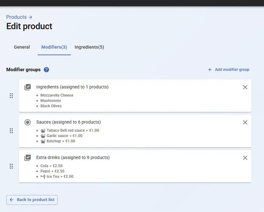 Here you can see the most important details about the existing modifier groups, like: their selection modes, names, the concrete modifiers they have and the product to which the modifiers are assigned.