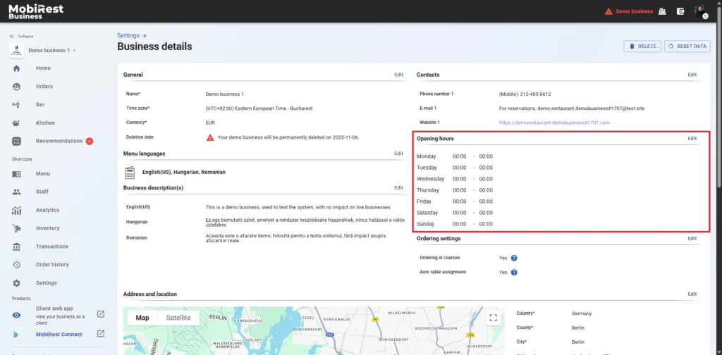 To set your business’s opening hours, go to “Settings” → “Business,” then click “Edit” in the “Opening Hours” section. (https://admin.mobirest.business/settings/business-settings)