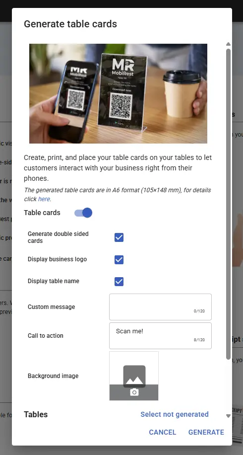 Dacă vă faceți afacerea vizibilă pentru clienți, trebuie să generați și să plasați carduri de masă pe fiecare masă. Aceste carduri conțin un cod QR pe care clienții îl pot scana pentru a vizualiza afacerea dvs. online, a răsfoi meniul și a interacționa cu serviciile dvs. de pe telefoanele lor.
